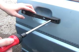 With a small screw driver, remove the trim on the door handle. Most new door handles come with new trim so if you mess it up, not a major deal.