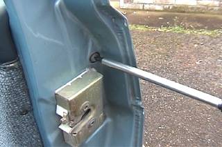Now lets remove the old lock asm from the handle so we don't have to add a new key to our pocket. This screw holds the "carrier" in place. The carrier is what flips the lever up or down on the door latch to lock or unlock the door. Put the key into the keyhole then remove the screw.