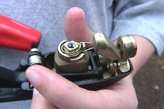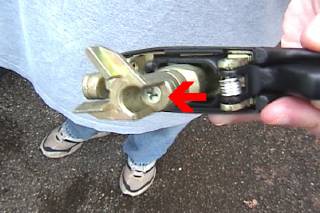 | Now remove the carrier. Be careful that the spring doesn't go shooting off and landing in the dog's waterbowl. Note how the spring is placed, this is very important. The spring is what make the key snap back to the center position when you are done locking or unlocking a door. Pull the spring off.